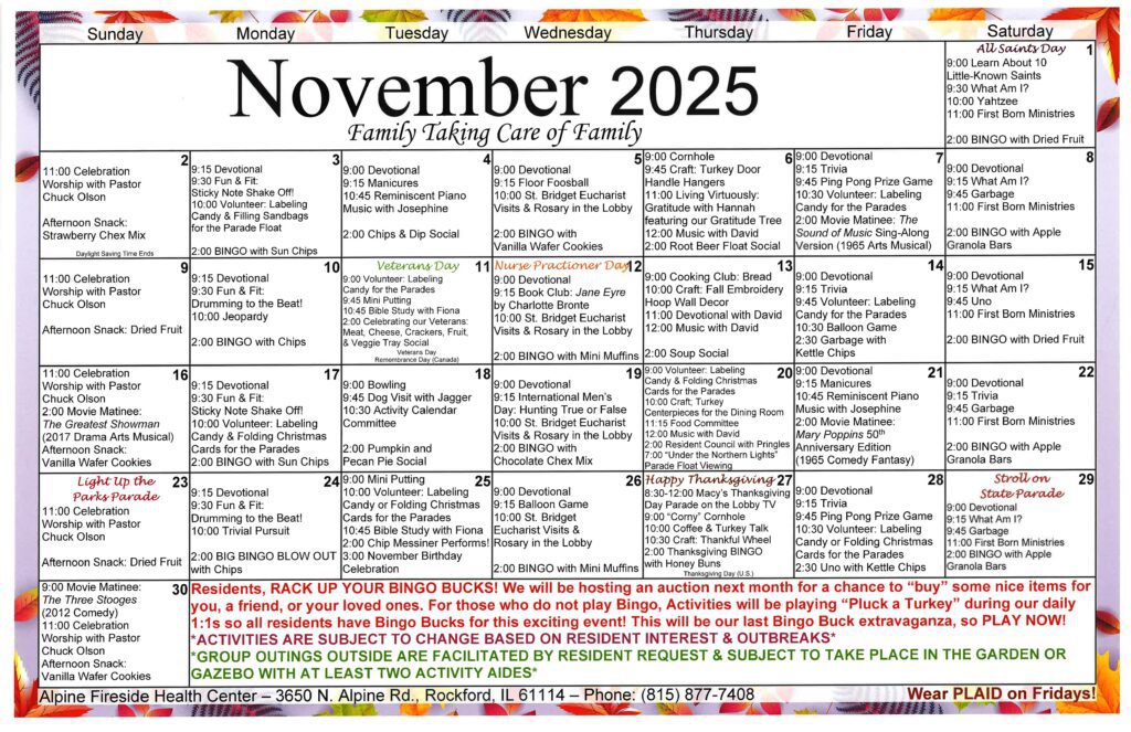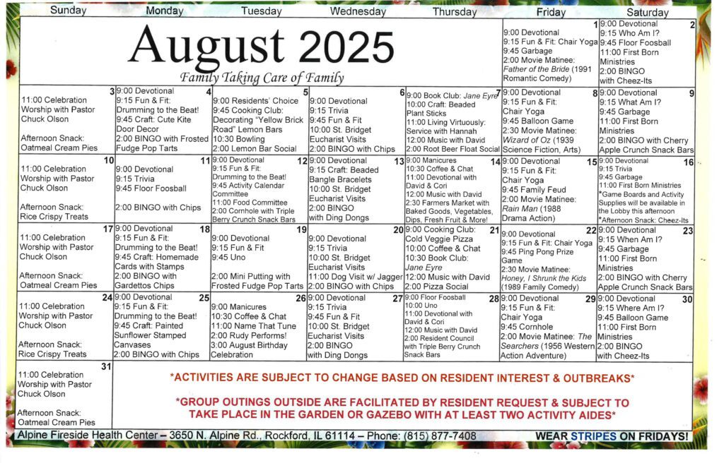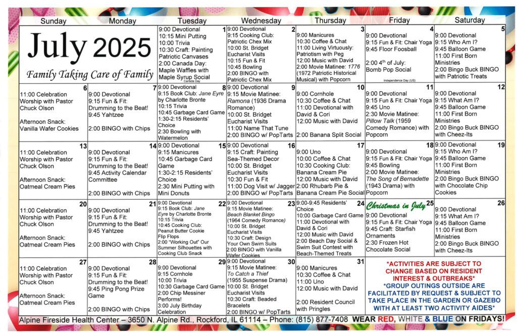 At Alpine Fireside, we believe life should be full of connection, joy, and purpose. That’s why our calendar is more than just a list of events—it’s a reflection of our commitment to whole-person wellness. Each activity is thoughtfully designed to support: